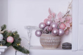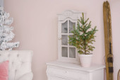 Piękna kompozycja choinki z zabawkami we wnętrzu jasnej białej sypialni, jadalni lub salonu w domu