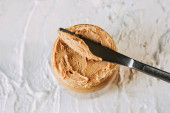 grube masło orzechowe w słoiku z bliska. Zdrowa jadła