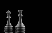 Renderowanie 3D. Metalowe normalne szachy mają cień króla lub królowej szachów na tle szachownicy. koncepcja siły ukrywania.