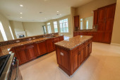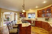 Zdjęcie "Nowoczesna kuchnia z czarnym Granit Counter Top & Bogate szafy drewniane" może być wykorzystywane do celów osobistych i komercyjnych zgodnie z warunkami zakupionej licencji Royalty-free. Obraz jest dostępny do pobrania w jakości wysokiej rozdzielczości do 5760x3840.