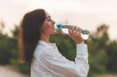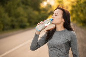 Piękna kobieta pije wodę jesienią i odpoczywa w parku
