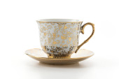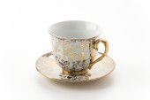 Talerz i kubek z ozdobą na białym tle. Herbata gotowa. Izolacja.
