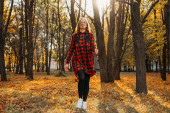 Kobieta w jesiennym płaszczu trzyma książkę. Jesienny park
