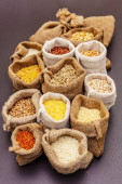 Zdrowe jedzenie wegetariańskie (wegańskie) koncepcja. Różne zboża ekologiczne, rośliny strączkowe, całe ziarna.