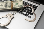 Kajdanki na notatniku z banknotami 100 dolarów amerykańskich, symbolizujące cyberprzestępczość