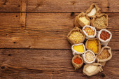 Zdrowe jedzenie wegetariańskie (wegańskie) koncepcja. Różne zboża ekologiczne, rośliny strączkowe, całe ziarna.