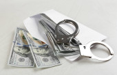 Kajdanki na komplecie odcisków palców, banknoty dolarów amerykańskich na kalkulatorze z podatkiem od przestępstw finansowych