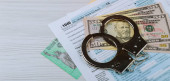 Skuwa przestępcę, odciski palców na kalkulatorze na banknotach dolarowych