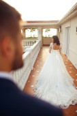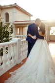 Zdjęcie "Pierwszy ślubny taniec nowożeńców. Pan młody trzyma pannę młodą za rękę tańczącą z nią w środku restauracji. Wzruszający i emocjonalny pierwszy taniec pary na ich weselu ze światłami." może być wykorzystywane do celów osobistych i komercyjnych zgodnie z warunkami zakupionej licencji Royalty-free. Obraz jest dostępny do pobrania w jakości wysokiej rozdzielczości do 5760x3840.