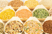 Zdrowe jedzenie wegetariańskie (wegańskie) koncepcja. Różne zboża ekologiczne, rośliny strączkowe, całe ziarna.