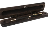 Piękne drewniane pudełko z długopisem wewnątrz na białym tle.