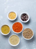Zdrowe jedzenie wegetariańskie (wegańskie) koncepcja. Różne zboża ekologiczne, rośliny strączkowe, całe ziarna.