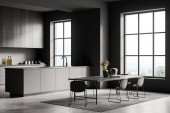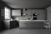 Zdjęcie "Widok z boku ciemnoszara kuchnia z obrazem" może być wykorzystywane do celów osobistych i komercyjnych zgodnie z warunkami zakupionej licencji Royalty-free. Obraz jest dostępny do pobrania w jakości wysokiej rozdzielczości do 5760x3840.