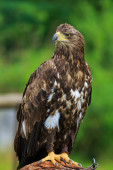Brązowy orzeł z żółtą łyżeczką z głową skręconą w prawo jest jeńcem z zielonym drzewem i trawą na tle. Przejdź się przez Park Narodowy. Dzień Letni, Zwierzęta domowe, Pionowe