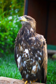 Zdjęcie "Brązowy orzeł z żółtą łyżeczką z głową skręconą w prawo jest jeńcem z zielonym drzewem i trawą na tle. Przejdź się przez Park Narodowy. Dzień Letni, Zwierzęta domowe, Pionowe" może być wykorzystywane do celów osobistych i komercyjnych zgodnie z warunkami zakupionej licencji Royalty-free. Obraz jest dostępny do pobrania w jakości wysokiej rozdzielczości do 5760x3840.