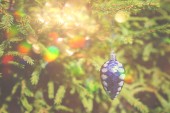 Boże Narodzenie i Nowy Rok dekoracji. Baw się w choinkę. dekoracje i lampki wakacyjne, przestrzeń do kopiowania, stonowane retro. czerwona bombka wisząca na ozdobionej choince. wakacje migające abstrakcyjny