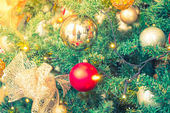 Boże Narodzenie tło drzewo Nowy rok gałąź z dekoracjami czerwone kulki prezenty i gwiazda, z bokeh światło