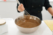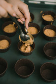 Kucharka wlewa brązowy cukier trzcinowy do metalowej miski. Słodycze do gotowania w kuchni.