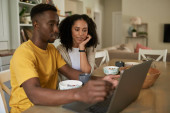 Zdjęcie "Młoda Afroamerykanka płaci rachunki przez Internet laptopem, siedząc razem na kanapie w salonie" może być wykorzystywane do celów osobistych i komercyjnych zgodnie z warunkami zakupionej licencji Royalty-free. Obraz jest dostępny do pobrania w jakości wysokiej rozdzielczości do 5760x3840.