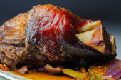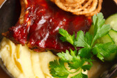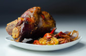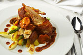 Pieczone ziemniaki i pieczone piersi kurczaka w sosie z kurczaka i białego wina z groszkiem, marchewką, nadzieniem wieprzowym i cebulowym oraz puddingiem Yorkshire, tradycyjnym angielskim jedzeniem