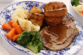 Pieczone ziemniaki i pieczone piersi kurczaka w sosie z kurczaka i białego wina z groszkiem, marchewką, nadzieniem wieprzowym i cebulowym oraz puddingiem Yorkshire, tradycyjnym angielskim jedzeniem