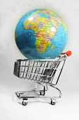 zabawka koszyk z małych kolorowych toreb na zakupy w pobliżu globu na białym, e-commerce koncepcji