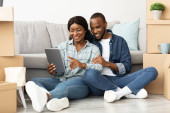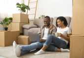 Zdjęcie "Szczęśliwa para przenosi się do nowego mieszkania, robi selfie przez telefon" może być wykorzystywane do celów osobistych i komercyjnych zgodnie z warunkami zakupionej licencji Royalty-free. Obraz jest dostępny do pobrania w jakości wysokiej rozdzielczości do 5760x3840.
