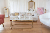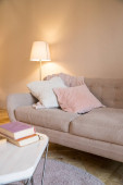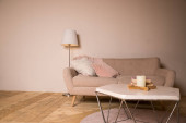 Mały stolik kawowy i świece obok zaprojektowanej sofy z pastelowymi kolorowymi poduszkami.Martwa natura szczegóły nordyckiego salonu. jasny salon wnętrza. elegancka sofa w salonie z różnymi