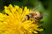 zbliżenie pszczoły miodnej siedzącej na kwiatach mniszka lekarskiego zbierającej pyłek