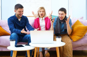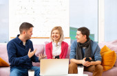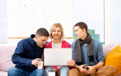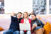 Przyjaciele siedzieć na kanapie, rozmowy i za pomocą smartfonu, komputer stacjonarny, laptop. Koncepcja społecznej media.