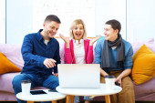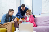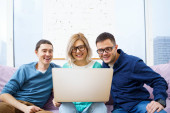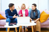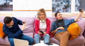 Zdjęcie "Przyjaciele siedzieć na kanapie, rozmowy i za pomocą smartfonu, komputer stacjonarny, laptop. Koncepcja społecznej media." może być wykorzystywane do celów osobistych i komercyjnych zgodnie z warunkami zakupionej licencji Royalty-free. Obraz jest dostępny do pobrania w jakości wysokiej rozdzielczości do 5760x3840.