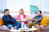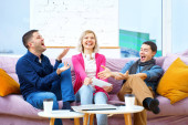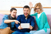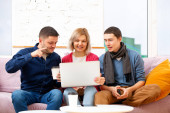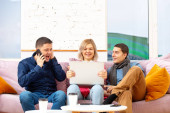 Przyjaciele siedzieć na kanapie, rozmowy i za pomocą smartfonu, komputer stacjonarny, laptop. Koncepcja społecznej media.