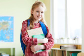Cute uśmiechnięta dziewczyna z dużym pudełkiem prezentów stojących przed kamerą w centrum handlowym podczas sezonowej sprzedaży przed Bożym Narodzeniem