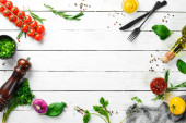 Białe drewniane tło gotowania. Warzywa i składniki. Widok góry. Wolne miejsce na tekst.
