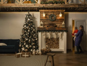 Pokój projektowy z choinką, sofą i kominkiem. Wnętrze ekostylu. Boże Narodzenie urządzone wnętrze kanapy i choinki, nowoczesne i przytulne. Szczęśliwego Nowego Roku i Wesołych Świąt
