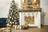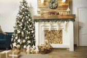 Pokój projektowy z choinką, sofą i kominkiem. Wnętrze ekostylu. Boże Narodzenie urządzone wnętrze kanapy i choinki, nowoczesne i przytulne. Szczęśliwego Nowego Roku i Wesołych Świąt