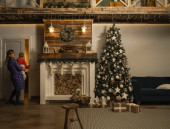 Pokój projektowy z choinką, sofą i kominkiem. Wnętrze ekostylu. Boże Narodzenie urządzone wnętrze kanapy i choinki, nowoczesne i przytulne. Szczęśliwego Nowego Roku i Wesołych Świąt