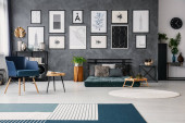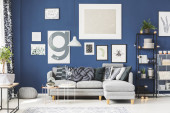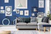 Zdjęcie "Wiklinowy puf na podłodze szarego, inspirującego wnętrza salonu z rowerem, narożną sofą i plakatami na ścianie" może być wykorzystywane do celów osobistych i komercyjnych zgodnie z warunkami zakupionej licencji Royalty-free. Obraz jest dostępny do pobrania w jakości wysokiej rozdzielczości do 5760x3840.