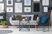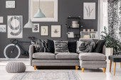 Wiklinowy puf na podłodze szarego, inspirującego wnętrza salonu z rowerem, narożną sofą i plakatami na ścianie