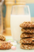 Ciasteczka owsiane i szklanka mleka na drewnianym stole.
