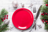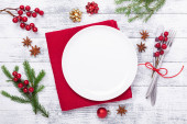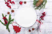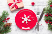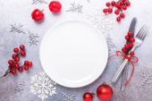 Boże Narodzenie miejsce stołowe ustawienie z pustym białym talerzem, pudełko na prezenty, sztućce z świąteczne dekoracje na kamiennym tle