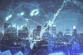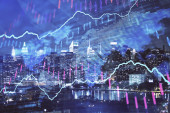 Wykres finansowy na nocny krajobraz miasta z wysokimi budynkami tła multi ekspozycji. Koncepcja analizy.