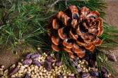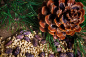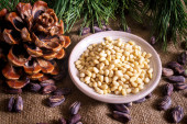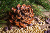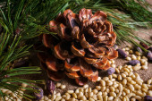 Zdjęcie "Stożek cedrowy z obranymi orzechami na stole." może być wykorzystywane do celów osobistych i komercyjnych zgodnie z warunkami zakupionej licencji Royalty-free. Obraz jest dostępny do pobrania w jakości wysokiej rozdzielczości do 5760x3840.