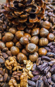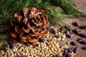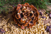 Stożek cedrowy z obranymi orzechami na stole.