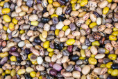 Kupa różowej i żółtej haricot dla tekstury tła, zbliżenie, widok z góry, kopia miejsca na tekst