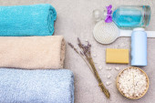 Koncepcja spa, naturalne składniki. Ręcznik kąpielowy, sól morska z lawendą, naturalne mydło oliwne, żel pod prysznic i szczotka. Na kamiennym tle, widok z góry