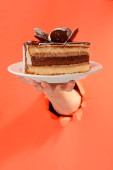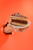 Ręka daje kawałek ciasta czekoladowego przez dziurę w żółtym tle papieru.
