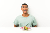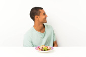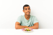 młody przystojny mężczyzna z sałatka w stół mając wątpliwości z mylić wyraz twarzy