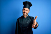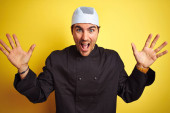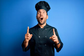 Zdjęcie "Młody przystojny kucharz gotuje w mundurze i kapeluszu na odizolowanym żółtym tle wskazując palcem w górę z udanym pomysłem. Wyjechany i szczęśliwy. Numer jeden.." może być wykorzystywane do celów osobistych i komercyjnych zgodnie z warunkami zakupionej licencji Royalty-free. Obraz jest dostępny do pobrania w jakości wysokiej rozdzielczości do 5760x3840.