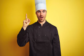 Młody przystojny kucharz gotuje w mundurze i kapeluszu na odizolowanym żółtym tle wskazując palcem w górę z udanym pomysłem. Wyjechany i szczęśliwy. Numer jeden..
